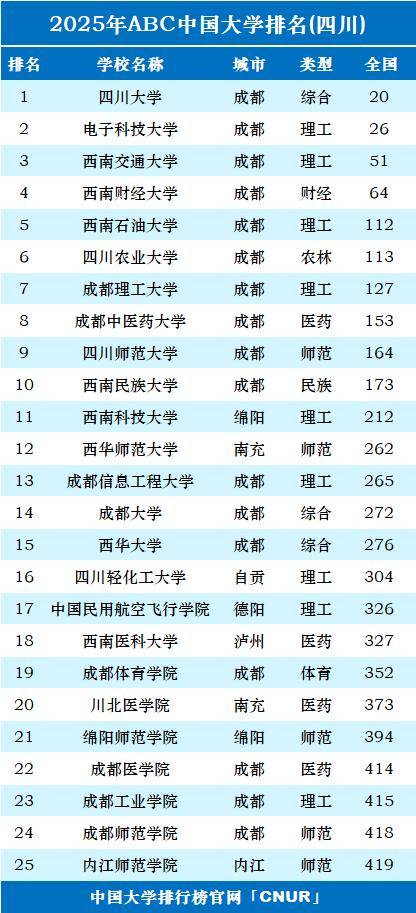 2025年ABC中国大学排行榜的发布,为四川高等教育版图注入了新的活力。在这份汇聚了全省35所高校的榜单中,四川大学以其深厚的学术底蕴和前瞻性的发展战略,再次蝉联四川省内榜首,并在全国范围内实现突破性跃升,位列第20位。作为西部学术的璀璨明珠,川大在“双一流”建设的征程中持续发力,其成果斐然。