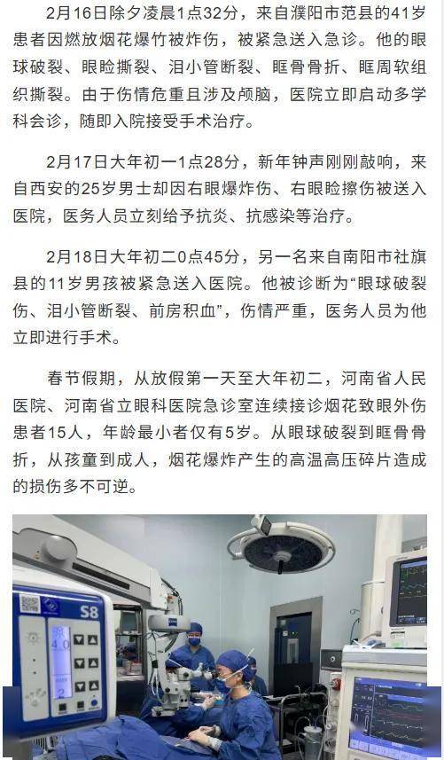 “每年春节,都是我们眼外伤最忙碌的时候。”河南省立眼科医院综合眼病和眼外伤中心主任陈红玲介绍,短短几天假期,通常会接诊到大量因燃放烟花爆竹导致眼睛受伤的患者。轻者经治疗可恢复部分视力,重者可能面临多次复杂手术,甚至无法保住眼球和视力。