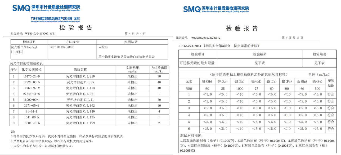 我们可以这么理解,拥有德国FSC认证的产品不仅材质是安全的,其材质来源也符合森林保护标准,可以说超环保了。而且经过深圳市计量质量检测研究院的严格检测,小手布书未检出任何荧光增白剂&重金属,确保了宝宝接触啃咬时的安全。